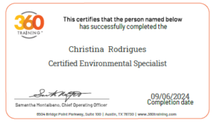 Christina Rodrigues: Becomes Certified Environmental Specialist